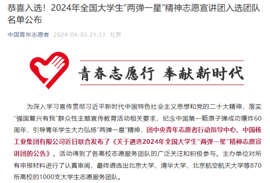 本网讯(通讯员 李兆银 李哲/文 李哲/图)4月3日,由团中央青年志愿者行动指导中心等部门举办的2024年全国大学生“两弹一星”精神志愿宣讲团、井冈山精神志愿宣讲团、延安精神志愿宣讲团入选团队名单公布,我院头雁实践队3个项目全部成功入选。