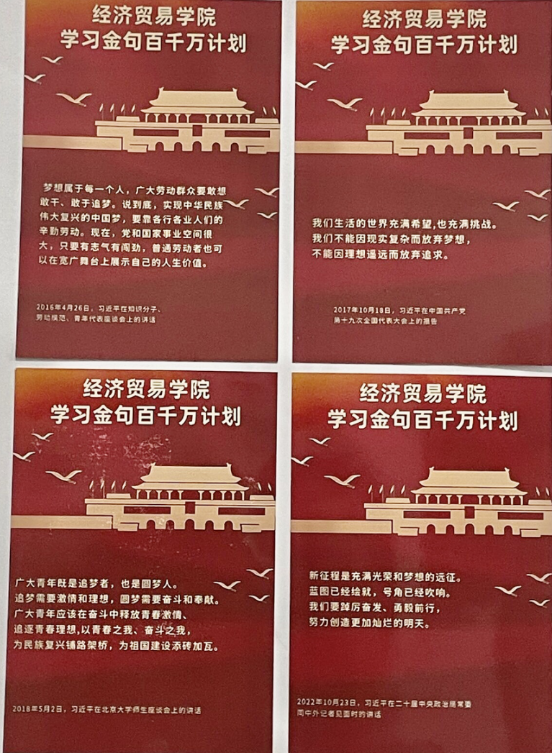 本网讯(李哲/文 杨斌凯 刘祯舜/图))习近平总书记强调“学习理论最有效的办法是读原著、学原文、悟原理,强读强记,常学常新”。为深入学习贯彻习近平新时代中国特色社会主义思想,以思想引领助力学生成长成才,本学期经济贸易学院启动了“学习金句百千万计划”。
