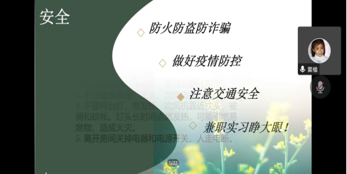 12月26日召开学工例会专题部署学生寒假安全工作,组织学习学校寒假学生教育管理工作的通知,细化落实假期疫情防控和安全教育,确保详实掌握学生动态数据,坚持学生日报、零报数据准时准确;元旦前分班级召开寒假安全主题教育,通过QQ班级群和今日校园向学生发布《高等学校寒假安全温馨提示》,全面落实寒假学生安全工作。